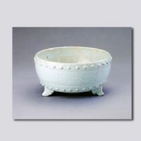 首都博物館藏。敞口,淺腹,平底,底部承以獸面三足。內(nèi)外施青白釉。內(nèi)心及外底均無釉,口沿及近底處各環(huán)飾一周整齊的乳釘紋,外壁刻串枝蓮花。器表釉色光潤,造型別致。