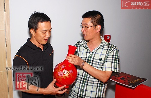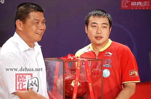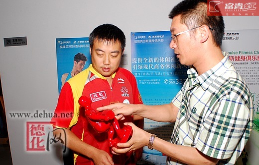 賽前,廈門市湖里區(qū)區(qū)委書記李棟梁與國乒隊互贈紀念品,著名運動員、國家男乒主教練劉國梁代表國乒隊接過了中國瓷都·德化富貴紅“天地五福”瓷瓶。富貴紅文化發(fā)展有限公司藝術(shù)總監(jiān)徐少東還向國家男乒贈送了富貴紅瓷雕“拼搏”以及“賞瓶”并預祝國乒隊在奧運會上獲得好成績,爭取包攬金牌。