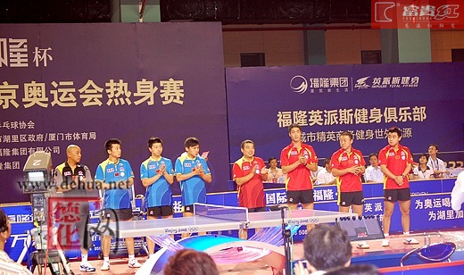 7月12日,正在廈門進行封閉訓練的國家乒乓球男隊在廈門湖里區(qū)中國乒乓球訓練基地舉行“福隆杯”中國乒乓球隊北京奧運會熱身賽。國家男乒即將參加奧運會的主力隊員王皓、王勵勤和馬琳(2008奧運隊),替補隊員陳玘、馬龍和張超(2012奧運隊)等優(yōu)秀選手登場亮相。