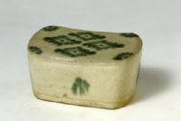 枕長方形,圓角,一側(cè)有孔。枕面白釉地,中央以綠彩繪4朵菱形花紋組合成的大菱形圖案,四角又各繪小朵花紋。釉面開細(xì)小紋片,底無釉。