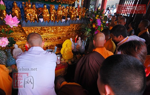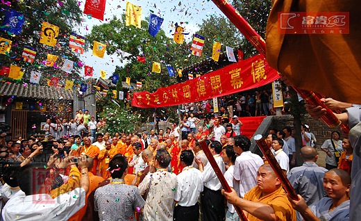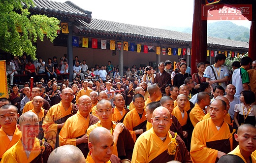 一大早,僧眾信士們便身披整潔的袈裟在寺院內(nèi)等候。法會(huì)在早上9:45正式開(kāi)始,少林寺方丈釋永信大師聯(lián)同美國(guó)、印度、斯里蘭卡、越南以及臺(tái)灣等國(guó)家與地區(qū)的107名高僧和全場(chǎng)僧眾一起唱念《大悲咒》、《心經(jīng)》,慈云堂外的居士信眾也都雙手合什,在心中虔誠(chéng)的默念經(jīng)文,現(xiàn)場(chǎng)氣氛無(wú)比的莊嚴(yán)肅穆,整個(gè)開(kāi)光儀式持續(xù)到11:00結(jié)束。