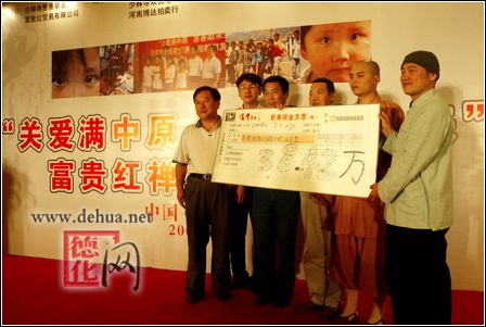 競拍結(jié)束后,在拍賣行工作人員的統(tǒng)計(jì)結(jié)束后,河南省富貴紅貿(mào)易公司現(xiàn)場將支票交給少林寺慈幼院的負(fù)責(zé)人,將為慈幼院的孤兒們捐建一座圖書館。