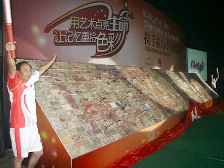 孫莉介紹說,2008塊瓷板就是2008份對奧運的祝福,這些瓷板通過拼裝組合后由成都本土藝術(shù)家完成后期加工創(chuàng)作并整體上釉,最終制成了這件永久留存的藝術(shù)品。當天晚上,兩位奧運火炬手與來自災(zāi)區(qū)的孩子及成都藝術(shù)家一起為奧運瓷板墻拼上了最后八塊瓷畫,從而完成了這件具有特殊意義的奧運祝福瓷板墻。