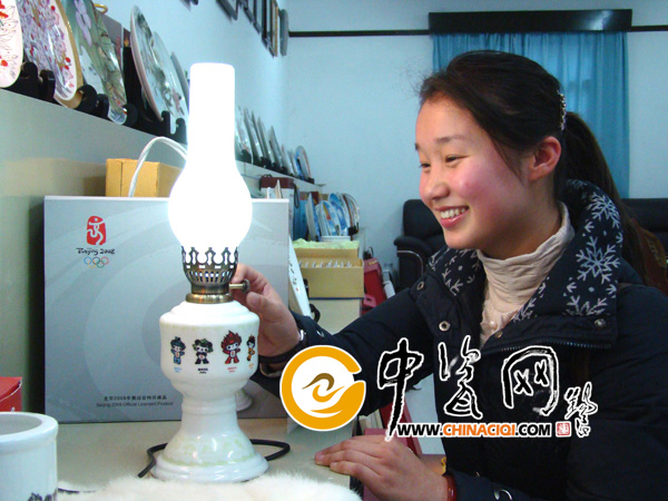 今年是奧運(yùn)年,奧運(yùn)瓷受青睞,悄然成為禮品新寵。圖為一名少女在江西省省陶研所禮品瓷銷(xiāo)售中心欣賞“奧運(yùn)福娃瓷燈”。 近日,景德鎮(zhèn)奧體瓷業(yè)有限責(zé)任公司生產(chǎn)的73款?yuàn)W運(yùn)陶瓷新品陸續(xù)在景德鎮(zhèn)奧運(yùn)瓷專賣(mài)店亮相,主要有項(xiàng)鏈、手鏈、耳環(huán)、掛件類、音樂(lè)瓷、文化擺件類、日瓷陶瓷類、雕塑類等種類,每一件瓷器都充滿了奧運(yùn)元素,充分展現(xiàn)了中國(guó)獨(dú)特的奧運(yùn)文化。