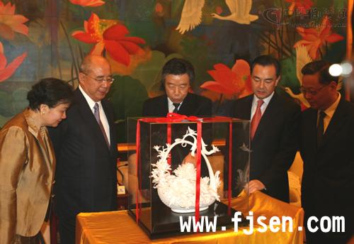 2008年8月14日晚,中共福建、省長黃小晶、省政協(xié)主席梁綺萍在廈門會見了來閩回鄉(xiāng)祭祖的中國國民黨主席吳伯雄及夫人一行。 雙方互贈禮物, 本次禮品由福建省德化縣大豐陶瓷研究所(東方玉)所長鄭少華先生研制瓷雕精品--繁花似錦。 國臺辦主任王毅、國臺辦常務副主任鄭立中,省領導何立峰、陳樺、劉德章、鄭道溪,廈門市市長劉賜貴會見時在座。