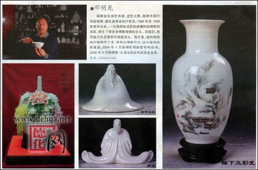 藝術(shù)追求無(wú)止境。在攻克釉下五彩瓷的難關(guān)后。鄧明龍又向更高的目標(biāo)發(fā)起了沖鋒,他把目光瞄準(zhǔn)了高科技繪圖、燒成難度極高、層次感分明的薄胎立瓷雕藝術(shù),不斷拓寬瓷雕創(chuàng)作的藝術(shù)領(lǐng)域。(刊于2008年8月13日福建廣播電視報(bào))