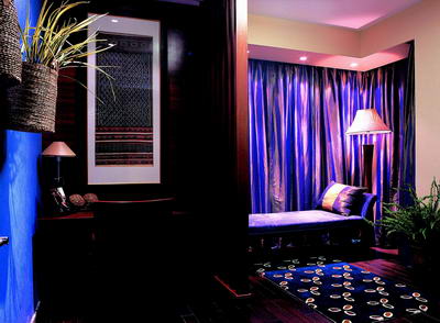 東南亞風(fēng)情,舒張中有含蓄,嫵媚中帶神秘,兼具平和與激情。把家打造成濃艷綺麗的東南亞風(fēng)情,它所帶來的不僅是視覺的錦繡多彩,更是生活的曼妙體驗。藍(lán)紫色的窗簾、地毯與床鋪打造出一個神秘異樣的睡眠空間。雖然面積并不怎么大,但整個空間充滿著無窮的魅惑感與迷幻感。
