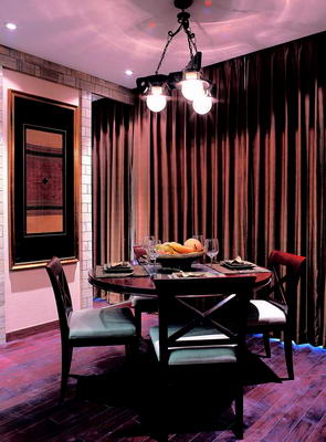 與客廳相鄰的是個簡單的小餐廳,簡潔利索的家具設(shè)置與燈光營造令整個餐廳顯得精致小巧,富有濃厚的生活情趣。與深櫻桃木色相配合,設(shè)計師在此處的窗簾設(shè)計上采用了穩(wěn)重卻帶有變化的淺棕色。雖然棕色會帶有沉重的厚實感,但隨著米色椅墊與暈黃燈光的渲染,整個色調(diào)顯得清爽了許多,伴隨著棕色窗簾的諸多色澤變化,整個餐廳充滿神秘氣息,富有濃郁的浪漫情調(diào)。