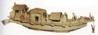 泥質(zhì)灰白陶。船身中間寬,首尾狹。船上分三個倉室,倉頂刻斜方格紋。船頭有碇,船尾有舵,船上有六人,分立於各部位正在操作,甲板上放置六組矛和盾。