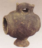泥質(zhì)灰陶,胎質(zhì)堅硬。鼓腹中空,兩端開口可以蒙皮。鼓上設(shè)一提梁,腹下置喇叭狀圈足。通體光素無紋。