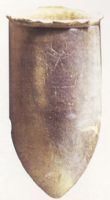 夾砂灰陶。侈沿,直口,筒形深腹,尖圜底。腹上部刻有“凸”,為圖像文字。此器為泥條盤築法手制而成,胎質堅硬,反映出大汶口文化較高的陶器製作和燒造水平。