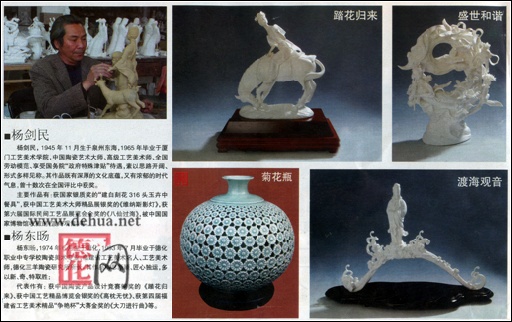 德化瓷器首先以其質(zhì)地美而訴諸人的直覺,同時又以其造型、裝飾的得體、適材構(gòu)成—種新的和皆,進(jìn)而顯現(xiàn)出材料的特性,突出了瓷質(zhì)的美,材質(zhì)與形態(tài)結(jié)合,相得益彰。楊劍民,中國陶瓷藝術(shù)大師,高級工藝美術(shù)師。從事陶瓷藝術(shù)創(chuàng)作四十年,潛心學(xué)習(xí),在造型上挖掘,獨(dú)樹一幟,創(chuàng)作設(shè)計(jì)出—批有鮮明德化窯風(fēng)貌,清新時代氣息的作品。他創(chuàng)作的《渡海觀音》作品平中見奇,在構(gòu)圖取勢以一股凌空而起的驚濤駭浪把觀音托舉起來,這—舉便成了首創(chuàng)之舉,它使德化瓷觀音從立巖,立蓮、立云等多種多年不變程式解脫出來,多了—個俯瞰眾生的新去處,那浪濤上下翻滾,千回百轉(zhuǎn),在磅礴氣勢中不失雋永精神。該作品1999年參加中國工藝美術(shù)大師精品展獲銅獎,2000年中國國家博物館作世紀(jì)收藏。