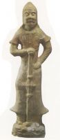 泥質灰陶。俑採立姿。頭戴圓頂兜鍪,護耳下垂至頸部,面龐方圓,雙目圓睜,雙唇緊閉,捲曲絡腮鬍。肩披燕尾狀披膊,身穿鎧甲,圓形護胸,內套窄袖衣。左手叉於腰際,右臂曲置胸前,手扶握一仗飾。胸、腰部各繫一帶,右腿略彎曲,足蹬圓頭靴,踏於方形臺座之上。鎧衣上施紅彩,衣襬部墨繪方格紋。