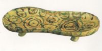 盤呈長(zhǎng)條形,中間束腰,兩端為圓弧形。盤口微斂,淺腹,平底,下設(shè)四個(gè)馬蹄足。盤身以淺黃色釉為地,上以綠、赭兩色繪同心圓狀花紋