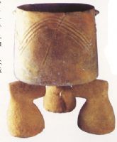 夾砂褐陶,手制。盂為橢圓形直口、微侈、筒形腹,腹壁微外強,大平底?谘叵掠兴牡阑⌒胃郊訔l紋,兩側(cè)各有一乳釘,底部有編織紋。支腳呈倒靴狀,頂面如窄楔,下中空。