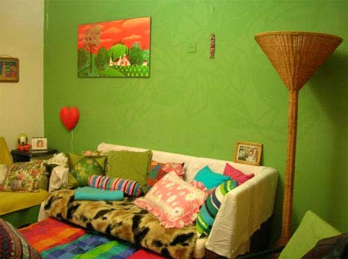 客廳大面積的綠色是一大特點,另外,加了紅色等對比強烈的顏色。