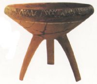 斂口,淺腹,折腹向內收,小平底,下附三個微弧的鴨嘴狀實足。外壁上以赭紅彩為地繪白色線條紋,呈“山”形環(huán)繞一圈。