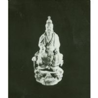 該像束發(fā)頂髻,面容慈安,身著寬袖長(zhǎng)袍,腳穿云頭高履,端座山石.旁塑有仙鶴一只,老者手執(zhí)蕉葉扇.釉色青綠,瑩潤(rùn)光亮,臉部、胸露赭紅色
