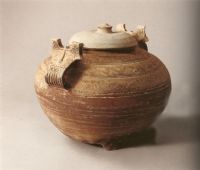 蓋呈弧面形,中心安一捉鈕。瓿身顯得矮而豐滿,其肩部粘附一對(duì)鋪首,鋪首寬大,上端超過(guò)口沿,并向外翻,鋪首面模印人面紋。