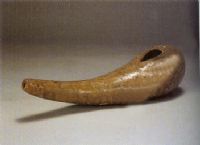 口小腹大,流部上翹。腹上有一口。平底露胎,胎質(zhì)灰白。裹外均施青黃色釉,有細小片紋。施釉較薄,有剝釉現(xiàn)象。為獸醫(yī)灌藥之器。