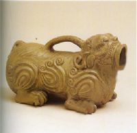 虎子口部刻虎頭,張口睜目,胸部刻卷毛,腰部兩側(cè)刻劃飛翼紋,四足為蹲伏狀,背有弧形提梁,股上貼塑虎尾,將山中之王──老虎的神態(tài)塑造得勇猛雄壯,形象逼真。整個(gè)器型顯得穩(wěn)重美觀,靜中寓動(dòng),富有生機(jī)。
