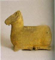 瓷羊作跪伏狀,昂首短尾,頭部刻劃雙眼、雙耳、口唇、鼻孔,雙角卷曲前伸,胡須為片狀,上飾刻線?诩邦^部圓孔插座與空腹相通。