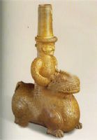 獸怒目,張口,獠牙外露,長尾垂地,獸身印圈形斑紋,筆劃鬃毛,以青中閃黃的釉色覆罩。造型奇特,制作精細,極為珍貴。從中空的高筒帽設計構思推測,此器當為插燭照明的燭臺。