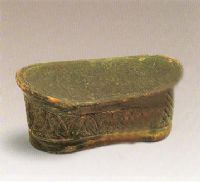 枕面為腰圓形,采用雕劃花工藝,枕面銘文用筆流暢生動,枕面外幫四周重飾邊圈線,并刻劃出簡潔向上的草葉紋,綠釉則先素?zé)咛,然后上綠釉烘烤,為兩次燒成。