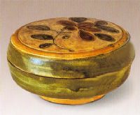盒圓形,子母口,底為圈足。盒蓋面兩道弦紋內(nèi)刻劃折枝花,花朵豐滿,枝葉卷曲。線條刻劃生動,分別施綠、白、褐色三彩。