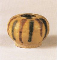 小口,扁圓,鼓腹,假圈足。近足部露灰色胎,施青釉,釉質(zhì)光亮,透明度較強,有細小開片紋?谥粮共坑韵聞蚍Q地加施褐綠兩色長短不一的條形紋飾,由上而下,濃淡自如,流暢自然。釉色鮮艷,器型渾圓,與小巧玲瓏的造型十分協(xié)調(diào)。