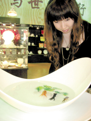 昨日,唐山國(guó)際會(huì)展中心展館展出了一個(gè)新奇的“魚缸”。據(jù)廠家介紹,這個(gè)造型別致的瓷器并非魚缸,而是為大型賓館、酒店設(shè)計(jì)生產(chǎn)的大沙拉盤。而將其作為魚缸則是他們?yōu)樵黾赢a(chǎn)品觀賞性的一個(gè)創(chuàng)意,使原本素面朝天的白色瓷盤有了生氣,也為整個(gè)陶瓷展區(qū)增添了一個(gè)小亮點(diǎn)。