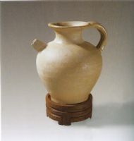 圓口,唇外侈,短頸,長圓腹較深,腹壁向下收,近底部又微薄,平底。肩部前方出一短流,後方為一扁圓把手,上與口沒相連,下和肩部相接。體表施白色釉,釉色均勻潤澤,胎潔白,質(zhì)較硬,燒造火候較高。器型由兩晉時期的執(zhí)壺演變而來,是唐代常見的器型。
