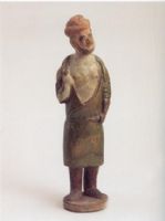 俑深目高鼻,虬髯絡(luò)腮,頭裹紅巾,歪著前視。身穿褐綠色窄袖開胸右袵長袍,肩披汗巾,袒胸露乳;腰系寬帶,足蹬褐色長筒靴。左手握于腰間,右手上曲扯衣領(lǐng)。此俑係中年胡人形象。