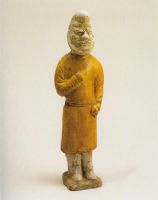 俑頭戴氈帽,深目高鼻,絡(luò)腮鬍須。身穿圓領(lǐng)窄袖黃色長袍,腰束帶,足著長筒靴。此俑係中年胡人形象。