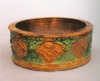 盤敞口,寬折沿,淺腹,圓筒形高座,平底。淡黃色陶胎,較堅(jiān)硬,上白色化妝土,內(nèi)施黃釉,座外壁施黃、綠兩色釉。
