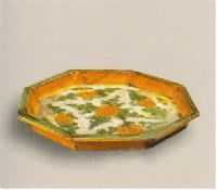 器呈八角形,折沿,淺腹,斜直壁,平底。淡紅色陶胎,胎質堅硬細膩,內外壁施黃釉,折沿處施綠彩,內底施白、綠、黃三彩釉。