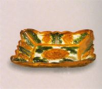 模制成型,器呈方形,曲邊,敞口,斜直壁,淺腹,平底。內(nèi)底有三個(gè)等距排列的支釘痕。