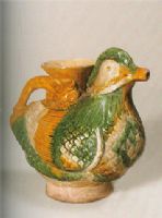 造型為浮水鴛鴦,背上有喇叭狀五瓣花形壺口,后部連接尾羽為一水波紋柄,鴛鴦?lì)^部昂起,兩眼凝視前方,嘴部中空為流,腹下素面無(wú)釉,平底假圈足,全身釉色混凝,但整體黃、綠、白三彩鮮艷絢麗,翅膀羽毛範(fàn)模壓印而成,猶如浮雕,極富立體感。