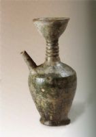 杯口,細長頸,豐肩,鼓腹,脛內(nèi)收,臥足外展,肩置一管柱狀直流。紅陶胎,上白色化妝土,滿飾綠色低溫鉛釉。頸部飾瓦溝紋,肩部飾一周凸弦紋,并劃刻有轉(zhuǎn)輪菊,紋飾線條流暢,造型古樸穩(wěn)重。