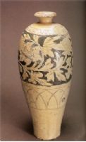 小口,短頸,豐肩,肩以下逐漸收斂,器型瘦長(zhǎng)秀麗。胎質(zhì)粗硬,雜質(zhì)感強(qiáng)。通過(guò)用刻花、剔花等裝飾技法對(duì)器物局部和整體加以修飾,白地黑花形成鮮明對(duì)比,畫(huà)面立體感強(qiáng),色調(diào)厚重雅致,為遼代缸瓦窯的佳品。