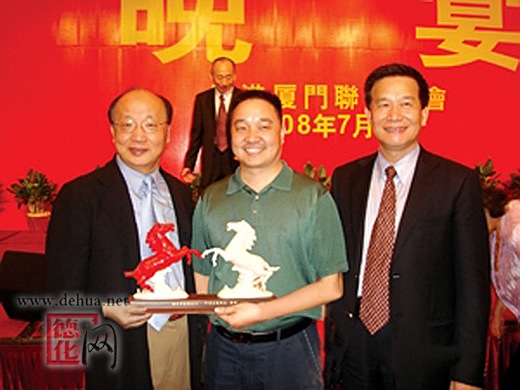 記者了解到,7月4日上午,臺(tái)中市長胡志強(qiáng)率領(lǐng)中臺(tái)灣縣市首長訪問團(tuán)167人,在臺(tái)中清泉崗機(jī)場搭乘上午9點(diǎn)20分起飛的華信737首航班機(jī)前往廈門,成為開放包機(jī)直航后,第一批“搶頭香”登陸的縣市長。當(dāng)晚香港廈門聯(lián)誼總會(huì)向臺(tái)灣貴賓贈(zèng)送由中國白陶瓷有限責(zé)任公司董事長陳仁海大師創(chuàng)作的中國白、中國紅瓷雕“馬到成功”。當(dāng)臺(tái)中市市長胡志強(qiáng)雙手接過禮品時(shí),感慨地說:“這是我收到的最貴重的禮物。從5月20日到7月4日,短短的40天時(shí)間,‘海峽兩岸周末包機(jī)’、‘大陸居民赴臺(tái)灣旅游’就實(shí)現(xiàn)了,真是馬到成功。陳仁海大師獨(dú)具匠心,我要把它作為鎮(zhèn)市之寶收藏起來”。
