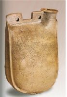 扁體高身,管狀口,唇沿,馬鞍狀雙孔系,小圓底內(nèi)凹。灰白瓷胎堅(jiān)硬細(xì)致,施白釉,釉色泛灰。腹兩側(cè)邊緣飾貼皮頁縫合裝飾,兩側(cè)面刻劃相同的卷草紋,繞雙孔外劃旋渦紋,刻劃線條流暢飄逸,作工精細(xì)?梢曌鬟|代雙孔扁身雞冠壺標(biāo)準(zhǔn)器。