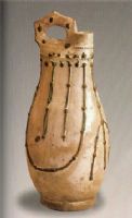 小圓口,短直徑,高身扁體腹部略鼓,手捏式四棱狀提梁,圈足。陶胎較為細(xì)膩。上白色化妝土。周身飾貼垂?fàn)钇l及釘痕裝飾,并在裝飾處點(diǎn)飾綠彩,典雅別致。施白釉,不到底。