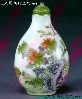 此煙壺上之圖案寓意“長治久安”。畫面布局疏朗,色彩雅麗,運用藍、紅、黃、綠、赭諸色繪制而成,采用先勾勒輪廓再填色的方法。顏色深淺不一,有立體效果。