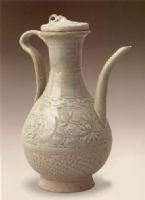 壺有印花蓋,與子母口相蓋合。壺口稍外撇,長頸,鼓腹,身似玉壺春瓶,圈足。從口沿至肩部裝有條形彎柄,另一側(cè)腹部裝弧形長流。