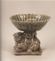 盞為花瓣口,盞心模印折枝花卉一朵,盞座為一臥獅。青綠釉顯細(xì)碎冰裂紋。此盞造型奇特,做工精細(xì),是宋代印花與雕塑相結(jié)合的代表作品。