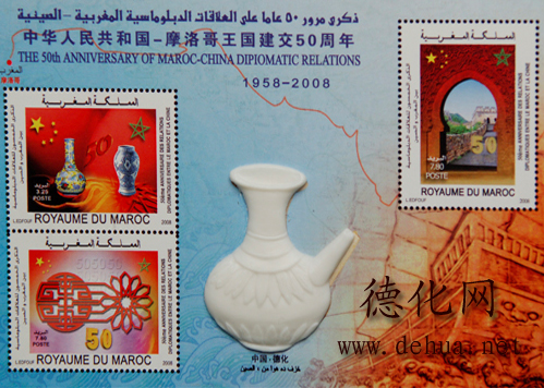 為了紀(jì)念中摩建交50周年,體現(xiàn)兩國(guó)之間的傳統(tǒng)友誼,摩洛哥郵政部門(mén)即將發(fā)行《中國(guó)與摩洛哥建交50周年》紀(jì)念郵票、絲綢鑲瓷小全張。這枚郵票由我國(guó)印制,該郵票圖案體現(xiàn)中國(guó)和摩洛哥兩國(guó)的獨(dú)有特色,選用中國(guó)瓷都德化白瓷鑲嵌于絲綢之上,并勾畫(huà)當(dāng)年由摩洛哥到德化“海上絲綢之路”的路線(xiàn),是世界首枚絲綢鑲瓷郵票小全張。