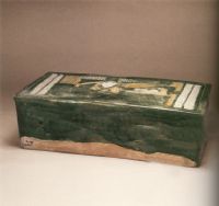枕面兩側(cè)刻有詩(shī)一首:[閨中少婦不知愁,春日凝妝上翠樓。忽見(jiàn)陌頭楊柳色,悔教夫婿覓封侯。]枕中心依詩(shī)意刻劃人物圖案;胎色灰白、通體施黃、綠、白三色釉;枕面詩(shī)后有[隆興紀(jì)元春二月張沖珍玩]款,底有[張家造]戳印。