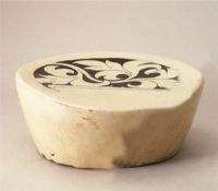 枕呈扁圓形,面大底小,枕底內凹。施白釉,略泛黃色,有小開片。底少部份涮醬釉,胎泛淺紅色。枕面呈半月形裝飾區(qū)繪黑地白花折枝牡丹,圖案簡練,別具一格,很富裝飾效果。