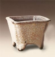 盆為四方形,委角,折沿,侈口,四垂云紋足,裹外施青釉,釉面開赭色紋片,裹心有五個(gè)支釘痕。宋代花盆的生產(chǎn)是為了滿足宮廷陳設(shè)的需要,其造型多樣,規(guī)格齊全。